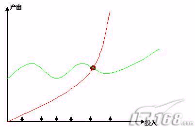 我們可以看到,投入和產(chǎn)出是按月增長的,那么億美目前呢,是(綠線)慢慢增長的一個(gè)曲線,隨著投入增加,持續(xù)是一個(gè)規(guī)模性的增長。這類似一個(gè)2003-2005年,持續(xù)是這樣一個(gè)營銷型的穩(wěn)步增長。那么,從2006年開始,這個(gè)地方(棕色)的出現(xiàn),開始出現(xiàn)新的變化和新的增長方式,那么我們說這個(gè)點(diǎn)叫做拐點(diǎn)。那么傾斜角度和產(chǎn)出就發(fā)生了變化了。那么比如今后發(fā)展到一個(gè)階段,新的平臺,新的內(nèi)容出來后,那么這個(gè)拐點(diǎn)也同樣會發(fā)生變化。