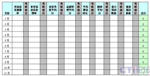 績(jī)效成績(jī)平均得分 | 此項(xiàng)指標(biāo)是考核客服中心整體工作水平的重要指標(biāo),計(jì)算方法為:績(jī)效成績(jī)總得分/考核總?cè)藬?shù)。 | 10 |