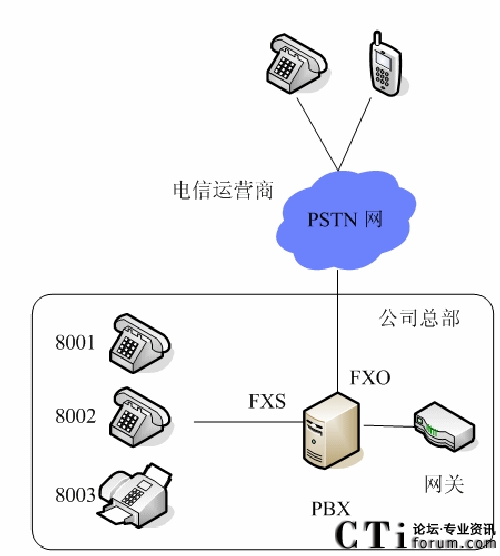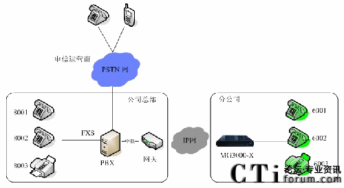 公司總部增加一臺語音網(wǎng)關(guān),通過中繼線與原有的PBX相連,異地分公司增加一臺IPPBX,下面開通分機(jī),公司總部和分公司通過IP網(wǎng)連接在了一起。