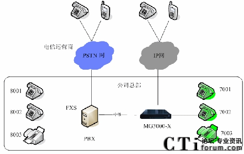 在公司總部增加一臺IPPBX(MG3000-X),通過中繼線與原有的PBX系統(tǒng)互聯(lián),在IPPBX上開通分機(jī)(7XXX), 新增員工的分機(jī):