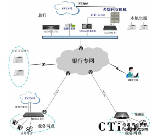本設(shè)計(jì)方案在內(nèi)蒙中行總部的專網(wǎng)配置統(tǒng)一的控制管理平臺(tái)用于對下面各網(wǎng)點(diǎn)終端的統(tǒng)一控制管理,另外配置多E1 IP數(shù)字中繼網(wǎng)關(guān)和中行內(nèi)部的電話銀行交換機(jī)對接,實(shí)現(xiàn)IP話路和中行的電話銀行系統(tǒng)的互聯(lián)。下面各網(wǎng)點(diǎn)、理財(cái)中心部署IP專線電話終端,用于銀行客戶在各營業(yè)網(wǎng)點(diǎn)拿起話筒就自動(dòng)自動(dòng)撥號(hào),通過銀行專網(wǎng)進(jìn)入電話銀行系統(tǒng)進(jìn)行語音互動(dòng)。