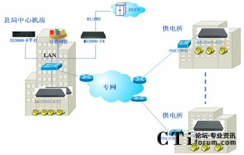 根據(jù)廣宗電力公司情況大唐高鴻提出在電力公司現(xiàn)有的網(wǎng)絡(luò)建立IP語音系統(tǒng),使各供電所、縣局間的語音服務(wù)運營在現(xiàn)有完善的IP網(wǎng)絡(luò)上,實現(xiàn)“語音、數(shù)據(jù)等業(yè)務(wù)融合”的先進(jìn)網(wǎng)絡(luò),通過縣局對全縣各單位電話系統(tǒng)統(tǒng)一控制管理。