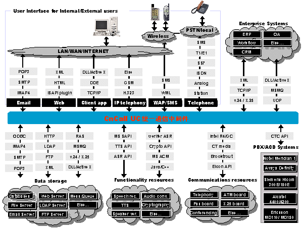 UC統(tǒng)一通信平臺(tái)是通信開發(fā)平臺(tái)的世界領(lǐng)先者, 提供功能強(qiáng)大而又迅速的開發(fā)技術(shù)來(lái)建立復(fù)雜的企業(yè)通信服務(wù)。這些技術(shù)包括CTI,傳真,數(shù)據(jù)通信,電子郵件,VXML, HTML,ASR,TTS, WAP,數(shù)據(jù)庫(kù)接入等。標(biāo)準(zhǔn)接口讓我們方便的與企業(yè)CRM、ERP、OA等系統(tǒng)連接。