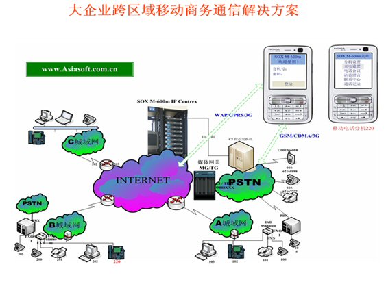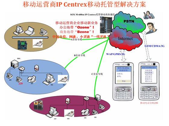 Mail,可發(fā)起WAP電話會(huì)議,可訪問企業(yè)的CRM、ERP等應(yīng)用軟件并集成點(diǎn)擊呼叫等等)。不僅移動(dòng)運(yùn)營(yíng)商可以替代第一代的移動(dòng)總機(jī),固網(wǎng)運(yùn)營(yíng)商采用SOX-M移動(dòng)軟交換也可以輕松的開展移動(dòng)總機(jī)(小靈通或手機(jī))的業(yè)務(wù)了,但SOX-M系統(tǒng)融合移動(dòng)運(yùn)營(yíng)商的無線互聯(lián)網(wǎng)數(shù)據(jù)業(yè)務(wù)將產(chǎn)生更大的利于企業(yè)應(yīng)用的前景,移動(dòng)總機(jī)(語(yǔ)音+WAP)的融合應(yīng)用成為第二代移動(dòng)總機(jī)殺手級(jí)應(yīng)用,令移動(dòng)總機(jī)如虎添翼。