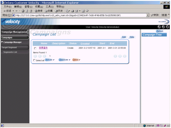 易虹德龍(Delano),所提供的Custoemr Velocity滿足了CRM用戶在電子營(yíng)銷方面的需求。在這個(gè)平臺(tái)上,CRM系統(tǒng)用戶,可以通過(guò)WEB界面,輕松地針對(duì)客戶分組制定和管理所有市場(chǎng)活動(dòng)。這些市場(chǎng)活動(dòng),通過(guò)多個(gè)步驟一步一步地抓住客戶的“心”。下圖是使用易虹解決方案進(jìn)行活動(dòng)管理的界面: