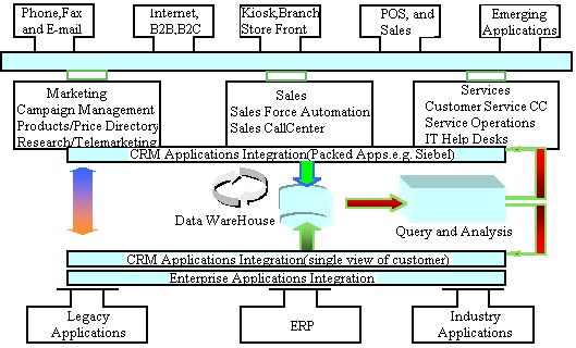 傳統(tǒng)的數(shù)據(jù)庫及中間件軟件廠商,都能提供一些“point solution”(指基于某一單獨技術領域),例如,單獨的客戶服務CallCenter方案,數(shù)據(jù)倉庫/商業(yè)智能BI解決方案。Compaq向客戶提供的是完整的CRM方案套件,其技術組成主要包括前端的基于多種接觸媒體(phone,fax,email,web)CallCenter;核心部分的Sales Force Automation,Marketing Automation,Service Operation;以及后端的DataWareHouse/BI,ERP及原有集成應用系統(tǒng)(Legacy Application)的集成等部分。通過下圖我們將詳細描述康柏的整體CRM方案框架及其解決方案:
