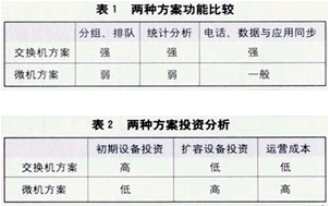 一般來說,最能影響呼叫中心運(yùn)行能力的功能特征有3個方面:分組排隊(duì)功能、統(tǒng)計分析功能以及電話、數(shù)據(jù)與應(yīng)用的同步功能。上述兩種方案比較列于表1和表2。