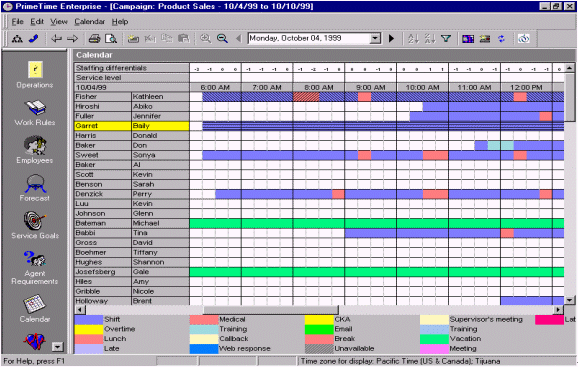 人員預(yù)測是一個每天、每周、每月、每年都需要作的工作計劃,為了能夠平衡呼叫中心人員的工作量和人員的可用性。通過將歷史數(shù)據(jù)和人員數(shù)據(jù)整合、加以分析,并借以WFMS體現(xiàn)出分配多少員工就可以達(dá)到既定的服務(wù)水準(zhǔn)。一旦需要員工數(shù)量被估算出來,那么工作安排也就是每天、每周、每月、每天的排班表的輪廓也就出來了。絕大多數(shù)的WFMS軟件的界面和操作都很相似,最主要的就是內(nèi)容就是要包含員工的姓名、員工的工作時間、員工的其他日程(最小單位是15分鐘),并且能夠提供具有多個管理軟件接口,和多種不同的管理方式。圖9.就是一個典型的人員排班表,以15分鐘為單位體現(xiàn)人員的工作安排。附加選項還可以包含"休假""遲到""曠工"等等,并且這排班表還可以通過歷史數(shù)據(jù)體現(xiàn)出哪個時段可能出現(xiàn)人員不足哪個時段容易出現(xiàn)人員過,F(xiàn)象。