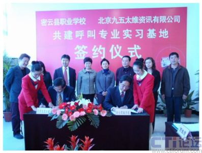 12月18日上午,密云縣職業(yè)學(xué)校與北京九五太維資訊有限公司校企合作共建呼叫專業(yè)實習(xí)基地簽約儀式在密云縣職業(yè)學(xué)校隆重舉行,市教委職成處處長李敏,縣委常委副縣長王春林、副縣長錢福生、副縣長徐芳出席簽約儀式并發(fā)表了講話。密云縣教委主任李鐘勤,北京九五太維資訊有限公司董事長汪遠(yuǎn),首席執(zhí)行官李寶民及其培訓(xùn)師團隊,密云縣經(jīng)濟開發(fā)區(qū)總公司及部分入?yún)^(qū)呼叫企業(yè)出席了簽約儀式。此次活動標(biāo)志著北京呼叫中心產(chǎn)業(yè)基地人才培養(yǎng)工作步入正軌,隨著以密云縣職業(yè)學(xué)校為主體的人才培養(yǎng)模式的確立,長期困擾呼叫行業(yè)人才短缺的困難有望得到解決。