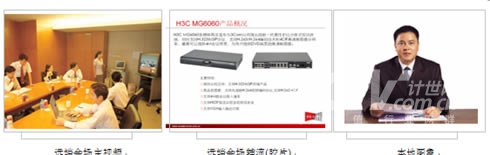 在主會場,分會場的會議室配備H3C高清視訊終端MG6060。H3C MG6060終端支持H.263、H.264等視頻編解碼協(xié)議,并采用了專有的視頻前、后處理技術(shù),使得圖像質(zhì)量大大提升,在周圍環(huán)境光照較差或者會場顏色搭配不甚和諧的情況下,仍舊能夠得到清晰、自然的圖像。視頻功能主要特色功能包括動態(tài)4CIF高清圖像、H.239雙視頻流傳送、畫中畫(PIP)、雙屏顯示、分屏顯示、VGA輸入、VGA輸出、桌面?zhèn)魉汀D像屏蔽、圖像參數(shù)調(diào)整等。有關(guān)H3C