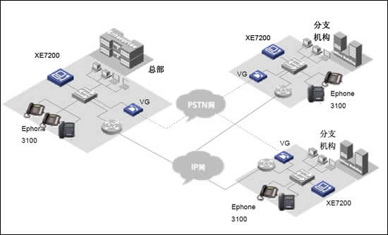 當(dāng)企業(yè)存在多個大型分部的時候,如一個國際性公司。則可以在各個分部部署XE7000冗余方案,每個分部維護(hù)獨立的本地用戶信息。各小分支機(jī)構(gòu)的IP語音終端可以直接注冊到本地XE7000上,從而實現(xiàn)整網(wǎng)的分布式部署。