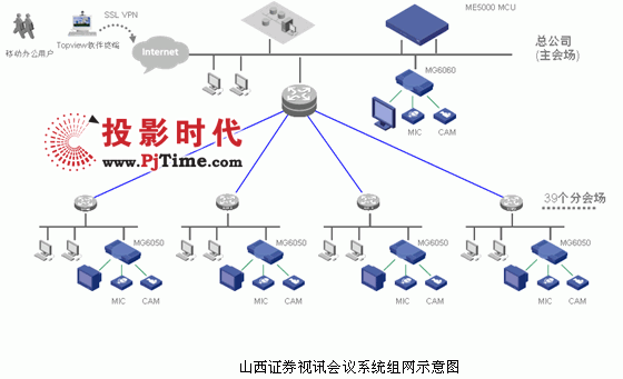 本套系統(tǒng)采用H3C ME5000 MCU+MG6060+MG6050的組網(wǎng)模式,總公司會場采用1臺MG6060,營業(yè)部會場采用39臺MG6050,實(shí)現(xiàn)了2M帶寬下的高清會議的連接,系統(tǒng)構(gòu)架圖如下: