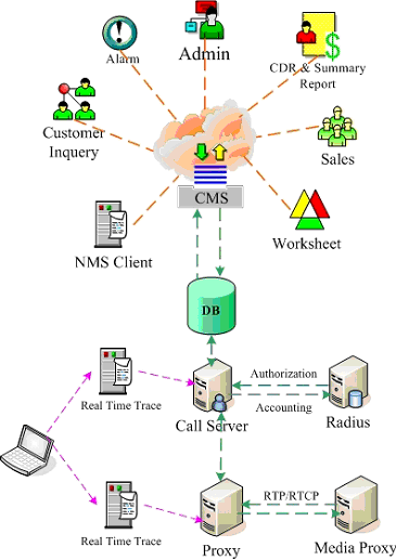 系統(tǒng)管理員通過Web和CMS對用戶進(jìn)行管理,并通過CS和PROXY所帶的網(wǎng)管功能(NMS)進(jìn)行實(shí)時(shí)的網(wǎng)絡(luò)監(jiān)控及維護(hù),及時(shí)診斷并處理故障。