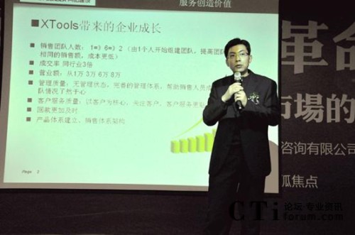 另外,濟(jì)南創(chuàng)弈工場(chǎng)總經(jīng)理趙小峰任曉峰與現(xiàn)場(chǎng)嘉賓分享了自身創(chuàng)業(yè)與成長(zhǎng)過程。創(chuàng)弈工場(chǎng)科技有限公司成立于2008年,是由山東大學(xué)創(chuàng)業(yè)團(tuán)隊(duì)發(fā)展而來的、以先進(jìn)電子商務(wù)架構(gòu)和企業(yè)CI設(shè)計(jì)專家為目標(biāo)的公司。趙總?cè)慰偸且晃?0后互聯(lián)網(wǎng)新銳,他表示:“公司運(yùn)用XTools具有管理思想的系統(tǒng)幫助管理這支年輕的隊(duì)伍,使其健康發(fā)展,對(duì)于創(chuàng)業(yè)者來說,銷售體系的管理是至關(guān)重要的,這樣我們少走了彎路。”