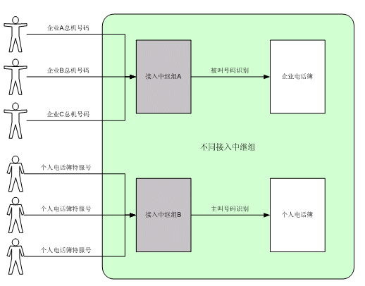 個(gè)人電話(huà)簿呼叫中,系統(tǒng)將根據(jù)主叫號(hào)碼,鑒別出主叫的身份,選擇進(jìn)入相應(yīng)的個(gè)人電話(huà)簿,提供個(gè)人電話(huà)簿服務(wù)。