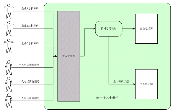 企業(yè)電話(huà)簿呼叫中,系統(tǒng)將根據(jù)被叫號(hào)碼判別進(jìn)入相應(yīng)的企業(yè)電話(huà)簿,提供相應(yīng)的集團(tuán)總機(jī)服務(wù)。如需在同一組接入中繼中同時(shí)提供企業(yè)電話(huà)簿業(yè)務(wù)和個(gè)人電話(huà)簿業(yè)務(wù),則系統(tǒng)將首先進(jìn)行被叫號(hào)碼鑒別。若存在與被叫號(hào)碼相對(duì)應(yīng)的企業(yè)電話(huà)簿,則提供企業(yè)電話(huà)簿服務(wù);否則,進(jìn)行主叫號(hào)碼鑒別,判斷是否提供個(gè)人電話(huà)簿服務(wù)。