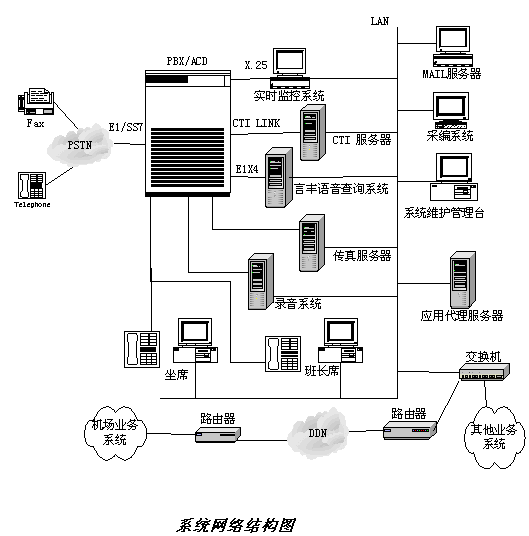 本系統(tǒng)采用E1數(shù)字中繼線接入電話網(wǎng),成為能夠在聲訊臺(tái)或機(jī)場獨(dú)立運(yùn)行的系統(tǒng)。