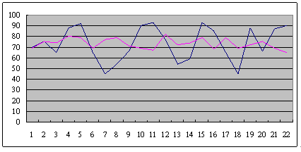 這是兩個座席員每天的通話利用率,橫軸是這個月從1號開始到14號,縱軸是通話利用率,藍色這位的平均通話利用率在70左右,粉紅色這位的平均通話利用率也是在70左右,但上下震蕩的很厲害,月初表現(xiàn)的很好,但從月中開始,通話利用率就一直明顯的下降。