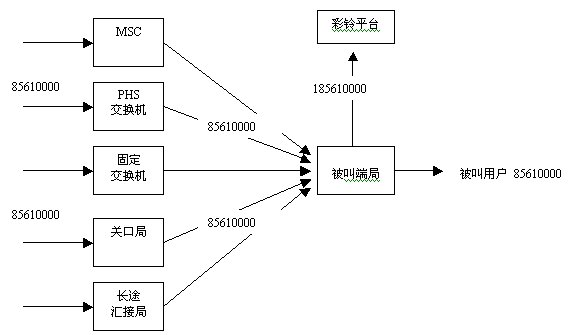 - 當(dāng)主叫呼叫彩鈴業(yè)務(wù)用戶歸屬的交換機(jī)時(shí)時(shí),被叫交換機(jī)判斷這個(gè)用戶有"彩鈴屬性"標(biāo)志,一面接續(xù)業(yè)務(wù)用戶(被叫),同時(shí)一面在被叫號(hào)碼前面加上一個(gè)彩鈴平臺(tái)的號(hào)碼前綴,這樣被叫號(hào)碼成了"前綴1+原被叫號(hào)碼",然后被叫交換機(jī)把這個(gè)新被叫號(hào)碼接續(xù)到彩鈴平臺(tái);
