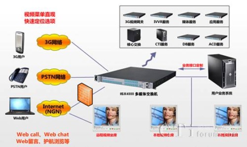 基于毅航通信ISX4000多媒體交換機(jī)的IVVR或視頻呼叫中心系統(tǒng)平臺可同時支持3G網(wǎng)絡(luò)、2G以及Internet網(wǎng)絡(luò)的接入;支持視頻、語音、傳真、郵件、短信等全方位服務(wù)模式;支持集中和IP分布式部署,座席數(shù)隨時隨地任意伸縮,可輕松形成一個跨區(qū)域、集語音和視頻于一體、統(tǒng)一的視頻呼叫中心系統(tǒng)。