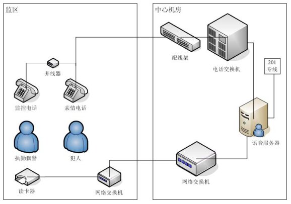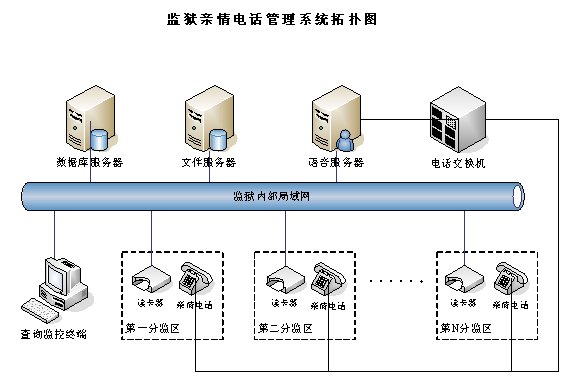 親情電話管理系統(tǒng)在系統(tǒng)設(shè)計(jì)中充分考慮監(jiān)獄的需求與特點(diǎn),不但包含了一般親情電話錄音所需的全部功能,而且還融合了獄政管理的功能,整個(gè)系統(tǒng)采用集中式方式,在中心機(jī)房部署一套親情電話錄音服務(wù)器,各個(gè)監(jiān)區(qū)監(jiān)控系統(tǒng)利用監(jiān)獄內(nèi)部的局域網(wǎng)聯(lián)結(jié)成一個(gè)整體,形成一個(gè)能監(jiān)控監(jiān)獄親情電話的全網(wǎng)。這樣即可以在每個(gè)監(jiān)區(qū)監(jiān)聽,也可以在監(jiān)獄內(nèi)部網(wǎng)的任何地方對親情電話進(jìn)行全程監(jiān)視。該系統(tǒng)能夠完全滿足目前監(jiān)獄的需求,產(chǎn)品性價(jià)比遠(yuǎn)遠(yuǎn)高于市場上其他同類產(chǎn)品。