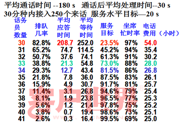 看上表的這個(gè)例子,36個(gè)座席工作時(shí),服務(wù)水平保持在91.7%,非常好,比80%的服務(wù)目標(biāo)高出了11個(gè)百分點(diǎn),如果少一個(gè)座席,比如說(shuō)抽煙去了,服務(wù)水平下降還不是很多,仍有87.5%。這時(shí)候,又有兩個(gè)座席說(shuō),服務(wù)水平還不錯(cuò),一塊兒抽支煙去,結(jié)果呢,服務(wù)水平降了多少?73%。這就是呼叫中心的關(guān)鍵少數(shù)法則:服務(wù)水平并不取決于大多數(shù)兢兢業(yè)業(yè)工作的座席,而是取決于少數(shù)不遵時(shí)的座席,由此可見(jiàn)遵時(shí)管理的重要性。