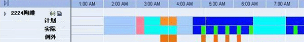 如圖,通過(guò)與PBX、CTI系統(tǒng)的接口,排班系統(tǒng)獲取座席的實(shí)時(shí)狀態(tài)信息,如登錄、接聽(tīng)、話后處理、登出等,并以不同的顏色進(jìn)行表示,與計(jì)劃的班次安排進(jìn)行比對(duì),從而監(jiān)控到座席的遵時(shí)例外(非遵時(shí))。通過(guò)這種方式,座席的實(shí)時(shí)狀態(tài)變化能夠及時(shí)的得到監(jiān)控,便于管理人員精確的監(jiān)控遵時(shí),同時(shí),也把班長(zhǎng)從遵時(shí)管理中部分解脫出來(lái)。
