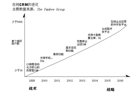 2005年是全球CRM市場(chǎng)發(fā)生天翻地覆變化的一年,CRM市場(chǎng)已達(dá)到120億美元規(guī)模(根據(jù)AMR數(shù)據(jù))。傳統(tǒng)應(yīng)用軟件商們紛紛涉足應(yīng)用軟件托管,但三心二意。傳統(tǒng)應(yīng)用軟件巨頭Siebel,因客戶(hù)選擇其托管CRM而通常不會(huì)再買(mǎi)其高利潤(rùn)的傳統(tǒng)CRM產(chǎn)品,其在市場(chǎng)推廣力度和技術(shù)服務(wù)水平上遠(yuǎn)不如Salesforce,Siebel最后被Oracle收購(gòu)。在Peoplesoft