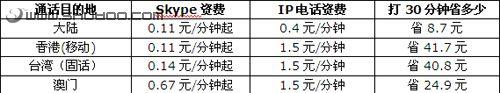 3G手機用Skype和固定電話通話的資費與傳統(tǒng)IP電話相比如何呢?見下表: