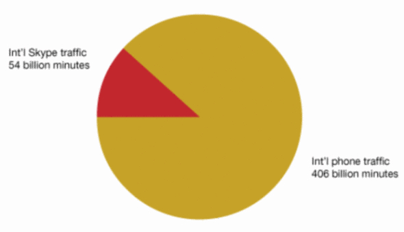 數(shù)據(jù)顯示,2009年全球國(guó)際長(zhǎng)途電話通話時(shí)長(zhǎng)為4060億分鐘,其中Skype至Skype的通話時(shí)長(zhǎng)為540億分鐘。TeleGeography表示,過(guò)去25年,通過(guò)電話機(jī)的國(guó)際長(zhǎng)途電話通話量年增長(zhǎng)率為15%,但過(guò)去幾年中這一增長(zhǎng)率有所下降。過(guò)去兩年,這類國(guó)際長(zhǎng)途電話通話量每年增長(zhǎng)率僅為8%。