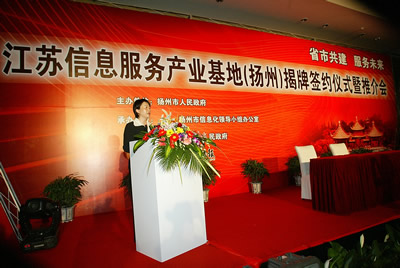 “腰纏十萬貫,騎鶴下?lián)P州”——在“煙花三月”最美的季節(jié),在“長江三角洲經(jīng)濟(jì)帶”最具活力的地區(qū),在榮獲“聯(lián)合國人居獎(jiǎng)”的揚(yáng)州,4月21、22日“江蘇信息服務(wù)產(chǎn)業(yè)基地(揚(yáng)州)揭牌簽約推介暨揚(yáng)州呼叫產(chǎn)業(yè)基地建設(shè)運(yùn)營管理論壇”隆重舉行,揚(yáng)州市市長、江蘇省信息產(chǎn)業(yè)廳廳長、揚(yáng)州人大等四套班子以及來自北京、上海及江蘇省內(nèi)的各信息產(chǎn)業(yè)的相關(guān)企業(yè)高管及業(yè)內(nèi)知名專家,帶著投資,帶著知識(shí),帶著對(duì)信息揚(yáng)州規(guī)劃的建議,齊聚揚(yáng)州,共商大計(jì)。