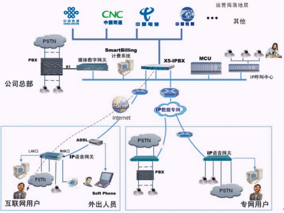 - 中心的X5-IPBX系統(tǒng)可以服務(wù)于互聯(lián)網(wǎng)用戶和企業(yè)內(nèi)部數(shù)據(jù)專網(wǎng)用戶,實(shí)現(xiàn)雙網(wǎng)匯接,使得不同網(wǎng)絡(luò)中的用戶可以實(shí)現(xiàn)IP電話通信。