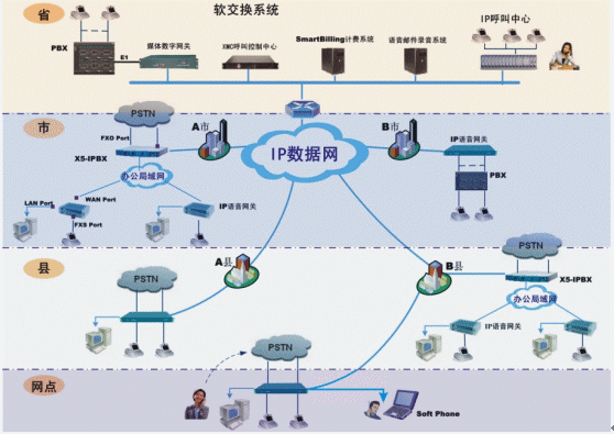 在各級(jí)辦公機(jī)構(gòu)根據(jù)原有用戶數(shù)量,可以配置IP電話綜合接入設(shè)備或IP-PBX,連接當(dāng)?shù)卦械霓k公電話環(huán)境(程控電話交換機(jī)、直線市話、電信虛擬網(wǎng)等)。實(shí)現(xiàn)機(jī)構(gòu)內(nèi)部辦公電話/傳真通過IP數(shù)據(jù)網(wǎng)通信。同時(shí)機(jī)構(gòu)以外的長途電話/傳真也可以利用IP電話網(wǎng)傳輸,而不產(chǎn)生任何長途通信費(fèi)用。