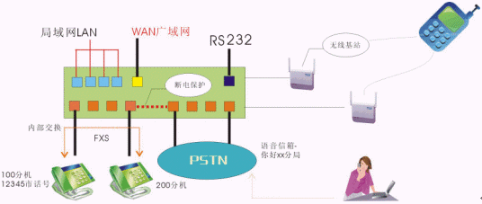 - 同時(shí)接入PSTN和專網(wǎng)電話,并在網(wǎng)關(guān)上實(shí)現(xiàn)內(nèi)部交換、語音信箱、和PSTN交換等功能