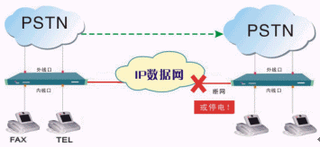 IP數(shù)據(jù)網(wǎng)故障或設(shè)備斷電時(shí),呼叫可自動(dòng)跳轉(zhuǎn)到PSTN市話網(wǎng),同時(shí)播放語音告警。