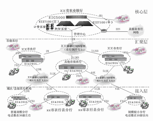 省行、各地市行與縣支行、分理處與數(shù)據(jù)業(yè)務共用專網(wǎng)線路,實現(xiàn)VOIP互連,形成一個全省范圍內的VOIP大網(wǎng),實現(xiàn)全省內部語音的免費通信和內部號碼的縮位拔號,節(jié)省了各行間的市話費用,節(jié)省大量長途話費。各節(jié)點按FXO:FXS