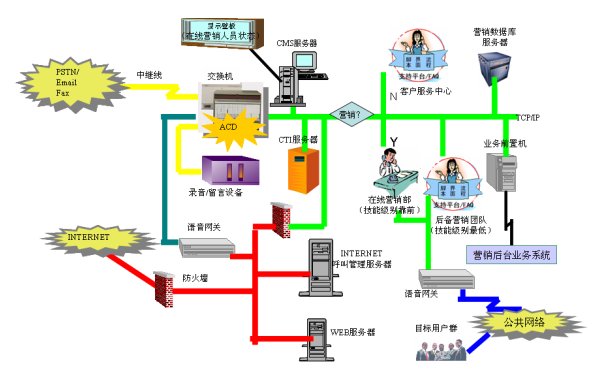 來(lái)自于公網(wǎng)的電話經(jīng)過(guò)交換機(jī)處理,經(jīng)過(guò)坐席人員判斷是否是銷(xiāo)售線索?然后轉(zhuǎn)接到相關(guān)的銷(xiāo)售代表處進(jìn)行接聽(tīng),在線營(yíng)銷(xiāo),同時(shí)營(yíng)銷(xiāo)人員在空閑時(shí)間通過(guò)客戶(hù)數(shù)據(jù)庫(kù)進(jìn)行外呼,挖掘商機(jī)進(jìn)行銷(xiāo)售。