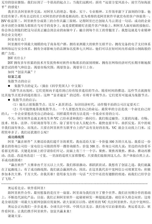 余輝先生在大會上表示,對于整個互聯網、軟件產業(yè)鏈條來說,在線軟件(SaaS)不但是最熱門的話題,更是順應市場需要的新技術趨勢,中寬網信將和阿里軟件一起,在打造全球“軟件沃爾瑪超市”的過程中發(fā)揮自己的技術應用研發(fā)強項,為全國2億互聯網網民提供更豐富便利、更低成本的軟件服務。余輝先生還和與會嘉賓分享了中寬網信和阿里軟件合作過程中的體會和感悟。