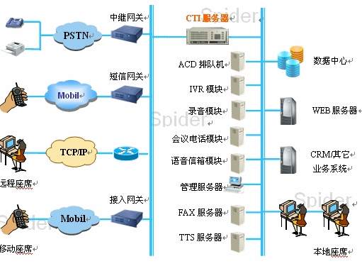 - 座席終端:座席使用的終端可以是IP電話、軟電話、手機(jī)(移動(dòng)坐席)、普通電話用戶等。如果用戶原來的終端為普通電話的話,可以通過IAD即可接入到系統(tǒng)網(wǎng)絡(luò)中,因此節(jié)省了用戶的投資。