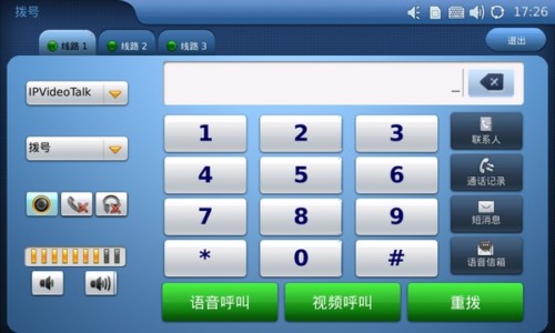 7寸大屏搭配寬大的數(shù)字虛擬鍵盤,讓你的撥號(hào)準(zhǔn)確無(wú)誤。同時(shí)界面的所顯示的通話功能諸如查找聯(lián)系人、查找通話記錄、發(fā)送短消息或者快速進(jìn)入語(yǔ)音信箱等功能也清晰明了。可以發(fā)現(xiàn)的是,用戶在輸完號(hào)碼之后可自主選擇采用語(yǔ)音呼叫還是視頻呼叫。另外,同潮流網(wǎng)絡(luò)之前的一款視頻電話GXV3140一樣的是,GXV3175也在出廠自帶了一個(gè)IPVideoTalk賬號(hào)。該賬號(hào)是出廠時(shí)就已配置好的,每一臺(tái)電話配備一個(gè)號(hào)碼并顯示在桌面上。也就是說(shuō),用戶在拿到GXV3175并聯(lián)網(wǎng)之后即可使用該賬號(hào)撥打免費(fèi)的視頻電話了。這可是很多廠商所沒(méi)有的特殊功能。下面我們就使用隨機(jī)附送的IPVideoTalk賬號(hào)來(lái)?yè)艽蛞曨l電話。