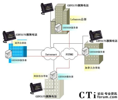 在Tabbara公司的全球四個(gè)辦事處分別安裝潮流網(wǎng)絡(luò)的GXE5028 IPPBX服務(wù)器或者其他的SIP Sever通信平臺(tái),GXE5028 IP PBX支持語(yǔ)音信箱,郵件和其他通信功能應(yīng)用,每一臺(tái)GXE5028最大限度地支持分布全球辦事處的所有通信賬號(hào)同時(shí)連接到同一網(wǎng)絡(luò)中,終端連接IP電話,IP視頻電話以及IP視頻監(jiān)控?cái)z像機(jī)作為語(yǔ)音/數(shù)據(jù)的輸入輸出,當(dāng)然IP PBX也可通過網(wǎng)絡(luò)連接到VoIP服務(wù)器中間位置的SIP中繼。潮流網(wǎng)絡(luò)的GXV3175多媒體觸摸屏視頻電話,支持標(biāo)準(zhǔn)的SIP協(xié)議,先進(jìn)的H.264/H.263/H.263+視頻壓縮標(biāo)準(zhǔn),寬大的7寸彩色觸摸顯示屏實(shí)現(xiàn)溝通面對(duì)面的零距離交流,以及撥打網(wǎng)絡(luò)攝像機(jī)觀看監(jiān)控現(xiàn)場(chǎng)。潮流網(wǎng)絡(luò)的GXV3662_HD高清防暴半球IP攝像機(jī)和GXV3651_HD IP攝像機(jī),分別安裝在辦事處關(guān)鍵位置,365天,每周24*7個(gè)小時(shí)進(jìn)行實(shí)時(shí)監(jiān)控,作為企業(yè)財(cái)產(chǎn)和人員安全的保障。方案中,各分支機(jī)構(gòu)之間通話免費(fèi),撥打分支機(jī)構(gòu)所在地其他電話按市話費(fèi)算,出差人員使用IP電話與公司內(nèi)部通話免費(fèi)。