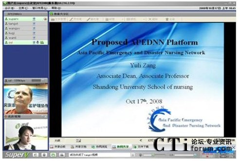 視維視頻會(huì)議系統(tǒng)良好的兼容性,使亞太地區(qū)各成員國的代表雖遠(yuǎn)隔千山萬水,依然可以實(shí)現(xiàn)無限溝通。視維視頻會(huì)議系統(tǒng)所提供的清晰流暢的音視頻使各成員國的代表無需走出國門,無需聚到一起,就可以輕松地網(wǎng)絡(luò)面對(duì)面的進(jìn)行交流,既可節(jié)約差旅費(fèi)用,又可避免舟車勞頓之苦,是各國代表有更多精力投入到工作中;視維的共享白板、共享文檔、文件下載等強(qiáng)大的數(shù)據(jù)協(xié)作功能可以使各國代表快速地共享更多的信息、資料,及時(shí)地開展越洋培訓(xùn)。近日網(wǎng)絡(luò)面對(duì)面地討論第三屆APEDNN的進(jìn)程及各項(xiàng)議題就是一次典型的應(yīng)用之一,不僅節(jié)約了差旅和時(shí)間成本,而且提高了工作效率,拉近世衛(wèi)各成員國之間的距離,天涯若比鄰,是各國代表在工作上更為默契,提高人類應(yīng)對(duì)突發(fā)事件與災(zāi)害的能力。