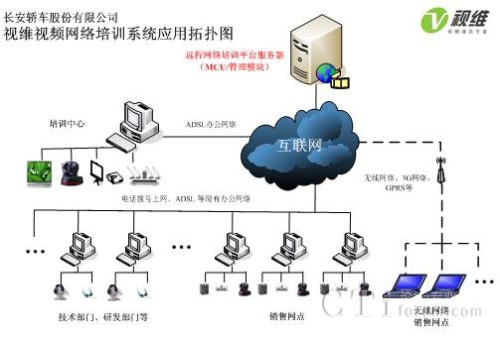 長(zhǎng)安轎車大規(guī)模網(wǎng)絡(luò)遠(yuǎn)程會(huì)議和培訓(xùn)系統(tǒng)由服務(wù)器端和客戶端組成,服務(wù)器端軟件部署在重慶中心機(jī)房,中心機(jī)房配置1臺(tái)單獨(dú)服務(wù)器,支持400個(gè)客戶端同時(shí)在線,負(fù)責(zé)所有會(huì)議和培訓(xùn)的召集、音視頻交互、加密等工作,長(zhǎng)安轎車各部門、轄下各零售點(diǎn)通過WEB方式(包括ADSL、3G無線等多種網(wǎng)絡(luò))即可實(shí)現(xiàn)客戶端軟件的自動(dòng)安裝與升級(jí),配備簡(jiǎn)單的攝像頭和話筒之后就可以實(shí)現(xiàn)長(zhǎng)安轎車以及400多零售點(diǎn)的大規(guī)模工作會(huì)議和高清音視頻網(wǎng)絡(luò)培訓(xùn)。網(wǎng)絡(luò)拓?fù)鋱D如下: