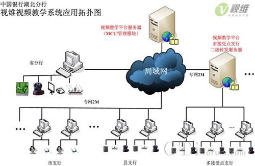 中國銀行湖北分行的視頻教學(xué)系統(tǒng)由服務(wù)器端和客戶端組成,服務(wù)器端軟件部署在省分行中心機(jī)房,配置2臺(tái)服務(wù)器,對(duì)于接受點(diǎn)超過5個(gè)的分支機(jī)構(gòu)配置二級(jí)轉(zhuǎn)發(fā)服務(wù)器,共支持全省各支行及支行內(nèi)多個(gè)客戶端同時(shí)在線,負(fù)責(zé)所有培訓(xùn)的召集、音視頻交互、加密等工作,各支行通過WEB方式即可實(shí)現(xiàn)客戶端軟件的自動(dòng)安裝與升級(jí),輕松實(shí)現(xiàn)實(shí)現(xiàn)省分行以及各支行共77余個(gè)接受點(diǎn)的高清音視頻視頻教學(xué)。同時(shí)為中國銀行湖北分行的視頻教學(xué)系統(tǒng)配置異構(gòu)兼容模塊,支持與其他視頻會(huì)議及軟、硬件視頻教學(xué)系統(tǒng)無縫融合,避免重復(fù)投資造成的浪費(fèi)。網(wǎng)絡(luò)拓?fù)鋱D如下:
