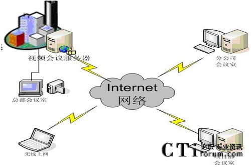 視維根據(jù)互聯(lián)網(wǎng)的網(wǎng)絡(luò)現(xiàn)狀和IT硬件資源制定了一套可行的平民化的低帶寬下的高清視頻會議解決方案。以企業(yè)總部為主會場,其他地區(qū)的分公司、各營銷網(wǎng)點和各移動多媒體終端作為分會場,其網(wǎng)絡(luò)拓撲圖如下: