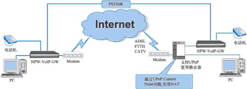 NPW-VoIP-GW作為客戶端VoIP網(wǎng)關(guān)置于各個(gè)企業(yè)分支機(jī)構(gòu)或家庭用戶桌面。其WAN接口可以連接各類同步modem以PPP方式或使用以太網(wǎng)口接入公網(wǎng)。同時(shí)NPW-VoIP-GW上的FXO接口可以連接PBX接入PSTN網(wǎng)絡(luò)實(shí)現(xiàn)備份功能。如圖所示NPW-VoIP-GW上連接的話機(jī)可以直接通過Internet或PSTN撥打?qū)Ψ健?br />