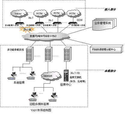 VAN(Voice Area Network)是一個支持多接入點、多承攬點、多業(yè)務(wù)點、多數(shù)據(jù)點的大型分布式呼叫中心構(gòu)造平臺。它針對大型分布式呼叫中心、企業(yè)營銷網(wǎng)絡(luò)及行業(yè)公共交換平臺的業(yè)務(wù)需求和技術(shù)需求開發(fā),支持多種接入方式并具備多種服務(wù)處理手段,同時可利用其軟件平臺——DCCMS呼叫管理系統(tǒng)對多種業(yè)務(wù)進行分散式管理,對各類資源進行統(tǒng)一控制,實現(xiàn)全網(wǎng)數(shù)據(jù)協(xié)同管理。