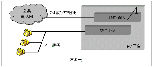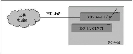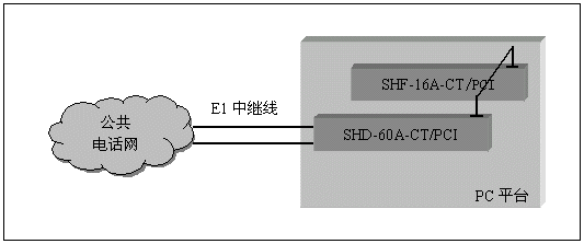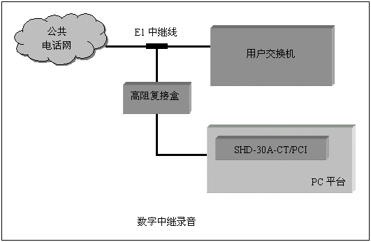 通道數(shù)較多的大中型應(yīng)用系統(tǒng),一般采用數(shù)字中繼線(E1)接入公共電話網(wǎng),三匯公司的SHD系列數(shù)字中繼卡可以提供相應(yīng)的解決方案。SHD系列數(shù)字中繼在一塊卡上集成了E1線接口,語音資源,信令處理等所必須的全部功能,其接入信令處理模塊可處理中國(guó)1號(hào)信令(SS1),7號(hào)信令(SS7),ISDN PRI協(xié)議(DSS1),單塊卡最多可支持4個(gè)E1接入。通過CT-BUS(或ST-BUS)總線,還可以在數(shù)字中繼線上實(shí)現(xiàn)傳真功能。典型應(yīng)用結(jié)構(gòu)如下圖: