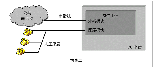 人工座席是呼叫中心(Call Center)一類應(yīng)用的主要組成部分。三匯語音卡對(duì)人工座席提供了兩套解決方案:使用SHU系列座席卡,通過交換總線與其它卡互聯(lián),為整個(gè)系統(tǒng)提供座席資源。使用SHT系列模塊化語音卡,在部分通道使用座席模塊,可用單塊卡實(shí)現(xiàn)座席和外線系統(tǒng)。第二種方式特別適用于小型呼叫中心,總機(jī)話務(wù)員等應(yīng)用。三匯公司的座席通道可以直接連接各類普通電話機(jī),利用座席卡配置相應(yīng)的軟件,還可以構(gòu)成板卡交換機(jī),完全取代企業(yè)用戶交換機(jī)。這類應(yīng)用的典型結(jié)構(gòu)如下圖: