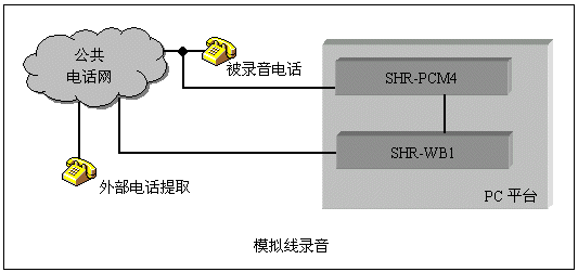 三匯公司的SHR系列監(jiān)控錄音卡可以實(shí)現(xiàn)對(duì)電話線路或其它信號(hào)源如話筒信號(hào)、對(duì)講機(jī)等進(jìn)行錄音。模擬線錄音采用高阻抗并線的方式,對(duì)被錄音對(duì)象無影響?梢詸z測(cè)電話線上直流電壓、DTMF號(hào)碼、FSK/DTMF CallerId等信號(hào)。采用配套的高阻復(fù)接盒,SHD系列數(shù)字中繼卡還能完成對(duì)數(shù)字中繼線的監(jiān)控錄音,并能分析線路上的信令,從而取得通話狀態(tài)和主被叫號(hào)碼。這兩種錄音系統(tǒng)的結(jié)構(gòu)如下圖: